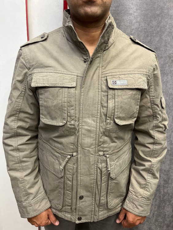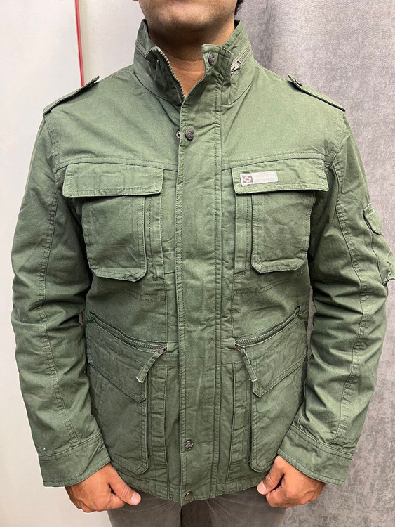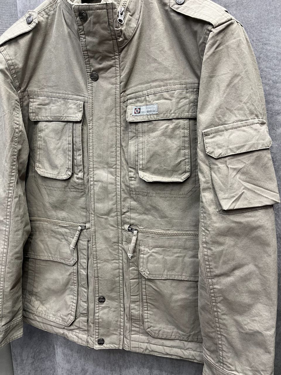 جیبهای متعدد جلو و بازو، یقه ایستاده با دکمه